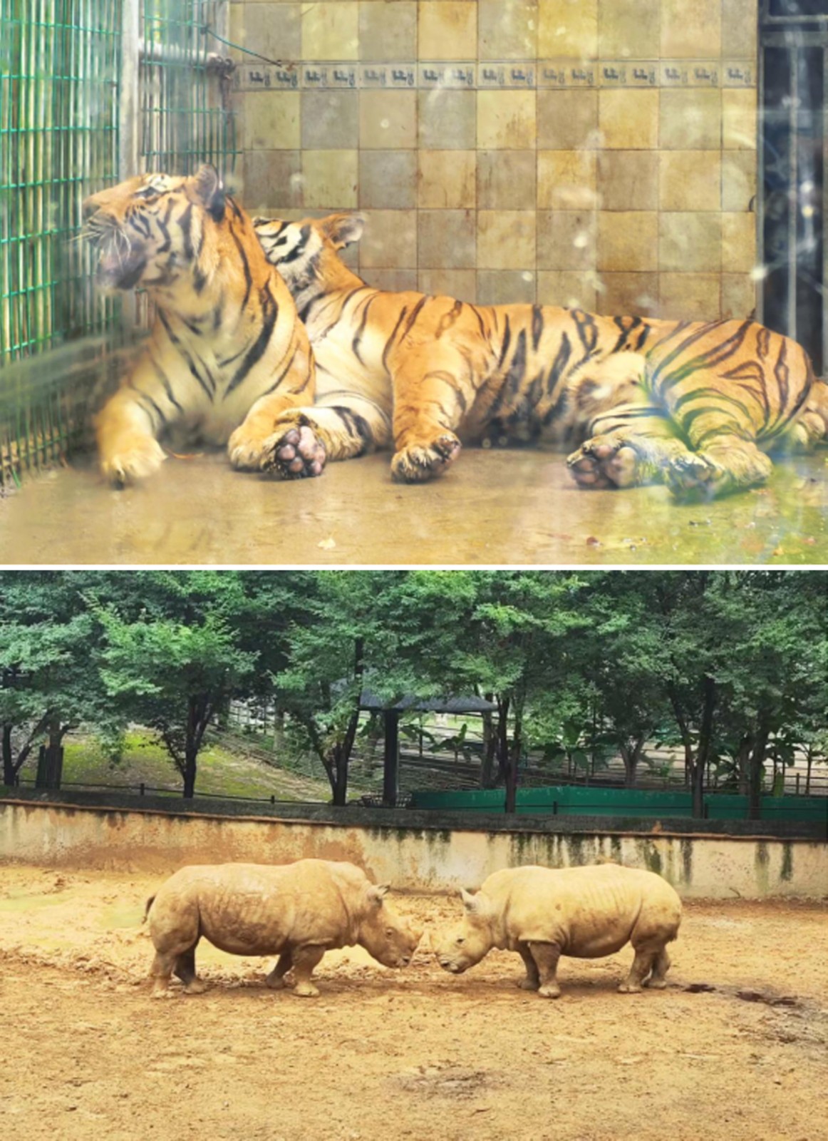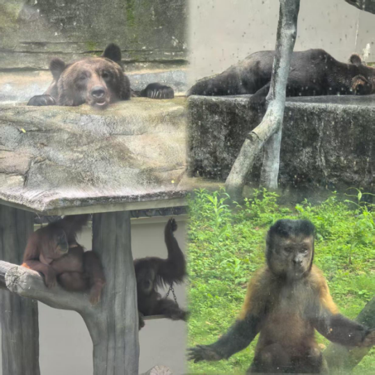 在老虎園區(qū)里,威風(fēng)凜凜的白虎和東北虎隔著籠子互相打量,時(shí)而發(fā)出低沉的吼聲交流,而另一邊的兩頭東北虎則親密地緊挨在一起打盹,斑駁的樹影灑在它們金黃的皮毛上。不遠(yuǎn)處的犀牛區(qū),兩只體型龐大的白犀牛正在上演領(lǐng)地之爭(zhēng),它們用粗壯的角互相頂撞,揚(yáng)起陣陣塵土,發(fā)出沉重的鼻息聲;非洲大羚羊區(qū)最是熱鬧,高大的羚羊們溫順地低下頭,伸著脖子吃著小朋友親手投喂的食物,長長的睫毛在陽光下忽閃忽閃。樹冠間,靈巧的長臂猿扒著樹干蕩著秋千,偶爾還會(huì)停下來好奇地觀察下方拍照的游客。園區(qū)主干道上,飼養(yǎng)員牽著一匹可愛的袖珍小馬漫步,珍珠馬的脖子上系著的鈴鐺隨著步伐發(fā)出清脆的聲響。整個(gè)園區(qū)洋溢著人與動(dòng)物和諧相處的氛圍。